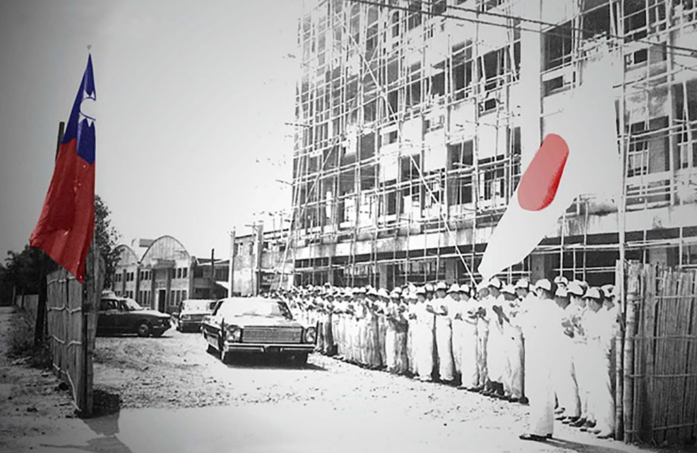 建設中の台湾本社工場前にて見学に訪れた本田宗一郎氏が乗る車を見送るKYMCO社員。
