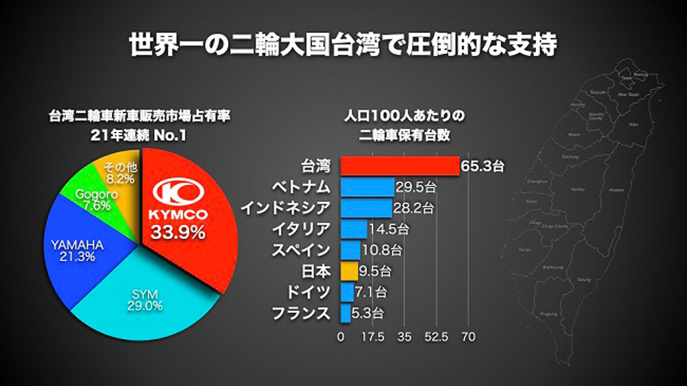 KYMCOの生まれ故郷である台湾は、人口100人当たり65台以上という世界一のオートバイ普及率を誇るオートバイ大国です。そしてKYMCOは台湾国内における新車販売台数19年連続第1位という実績を誇る、名実ともに台湾No.1のブランドです。オートバイが生活に密着した台湾ならではの耐久性や消耗品の供給・修理といったアフターサービスへの高い要求を満たすことが出来なければ、今日のKYMCOの成功は成しえないといっても過言ではないでしょう。
