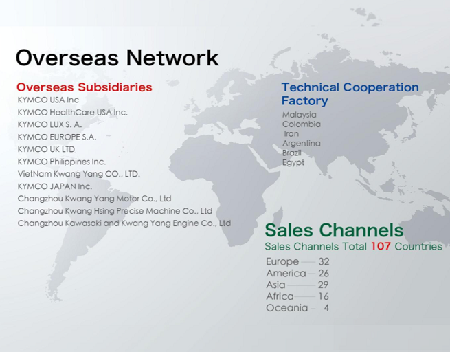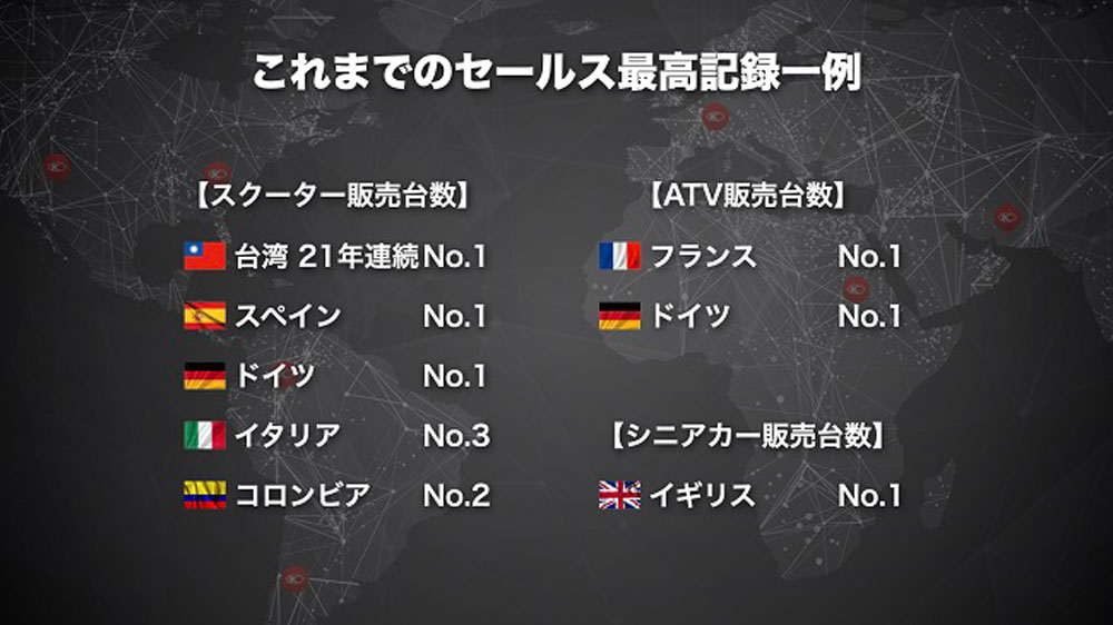 世界進出を遂げたKYMCOブランドは、ドイツやイタリア、スペインなどヨーロッパをはじめとする世界各国で広く認められ、特にKYMCOの主力製品であるスクーターとATVのカテゴリーではトップクラスのセールスを記録しています。