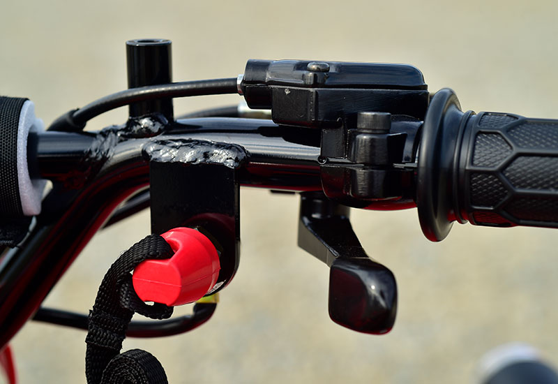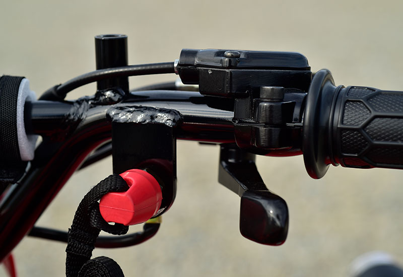転落時等に引き紐式でエンジンが停止する装置が付いています。赤いキャップが紐で引っ張れて外れるとエンジンが停止します。