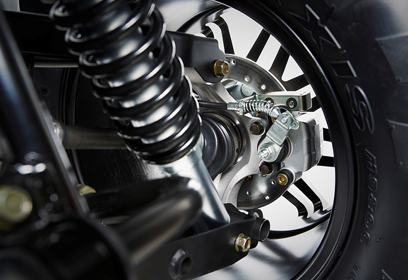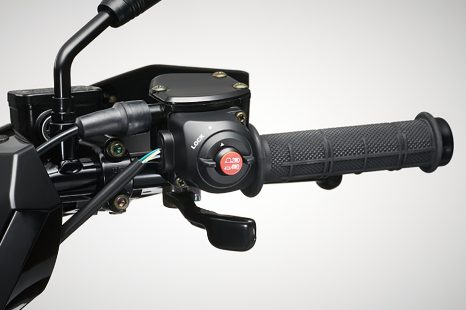 標準装備となるニューデザインの14インチアルミホイールには、エアボリュームが大きく悪路でも強力なトラクション性能を発揮するオフロード専用タイヤを装備。フロント幅8インチ(約205mm)リア幅10インチ(約255mm)外径は共に26インチ(約660mm)とオフロード専用車ならではの迫力あるサイズを採用しています。四輪に備えられたディスクブレーキはブレーキレバーによる前後独立制動のほか、フットペダルによる全輪制動が可能な3WAYタイプを採用しました。