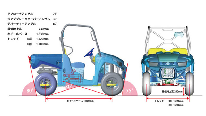 オフロード専用に設計されたボディはアプローチアングル75°、ランプブレークオーバーアングル30°、デパーチャーアングル80°という優れた対障害角度を確保。ロワアーム部で230mm、フロア部で254mmを確保した最低地上高や、フロント1,220mm、リア1,200mmのワイドトレッド、1,830mmのショートホイールベースにより優れた悪路走破性を実現しています。