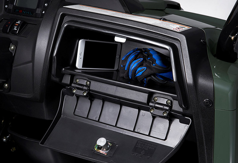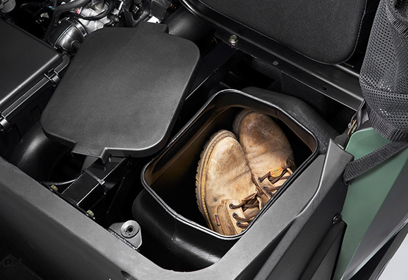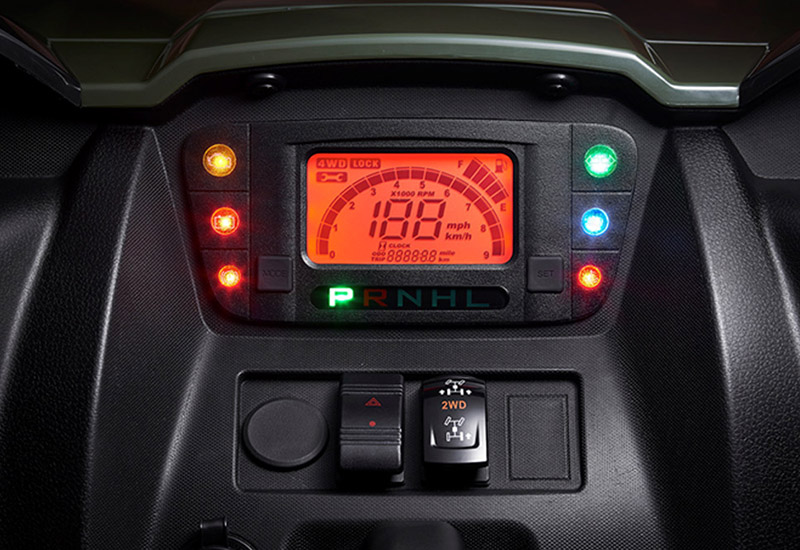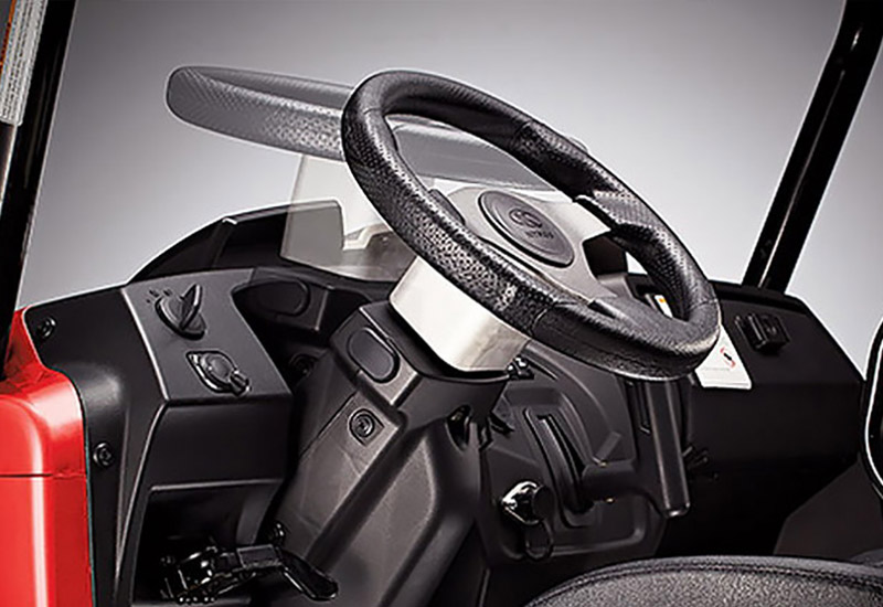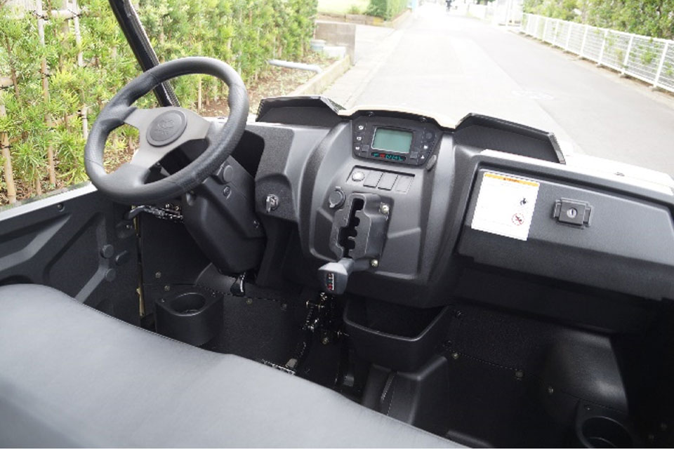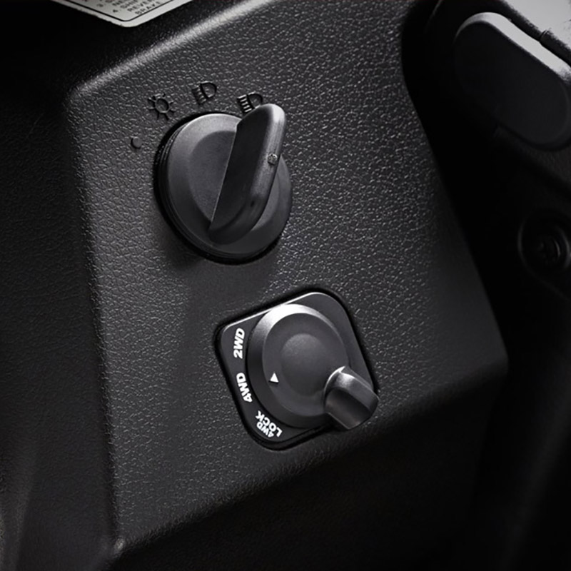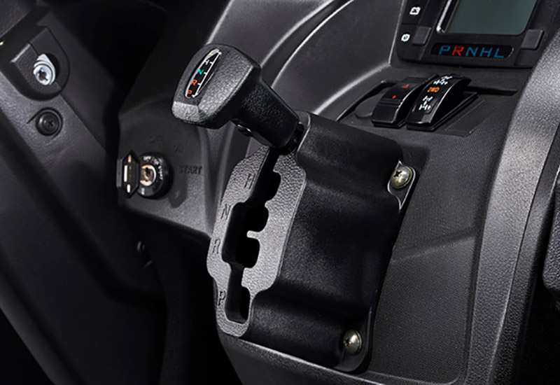 CVT方式による無段変速のオートマチックトランスミッションは、HI↔️LOの副変速機構のほか、電子制御式の2WD↔︎4WD↔︎4WDデフロック切り替え機能を搭載、走行状況に応じて最適な駆動方法を選択可能です。後輪の駆動はデファレンシャルを介さない左右輪直結方式のため2WD状態であっても高い走破性能を発揮します。※日本仕様にはリアデフは装備されていません。