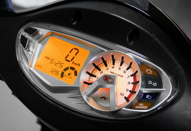 メーターは多機能液晶とアナログタコメーターを組み合わせたコンビネーションタイプ、左側の液晶部分にはデジタルスピード・オドメーター・トリップメーター・時計・燃料計を配置、右側にはアナログ表示のタコメーターと各種警告灯を配置しました。