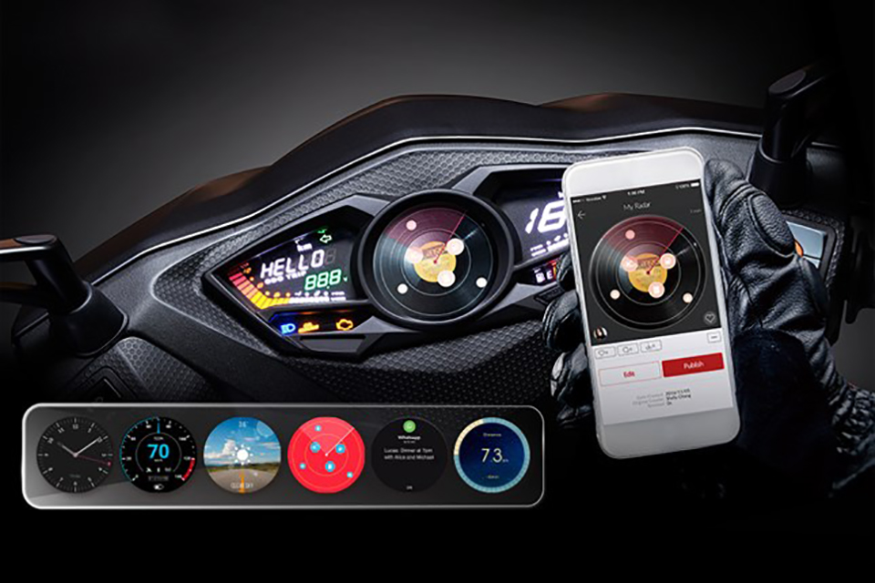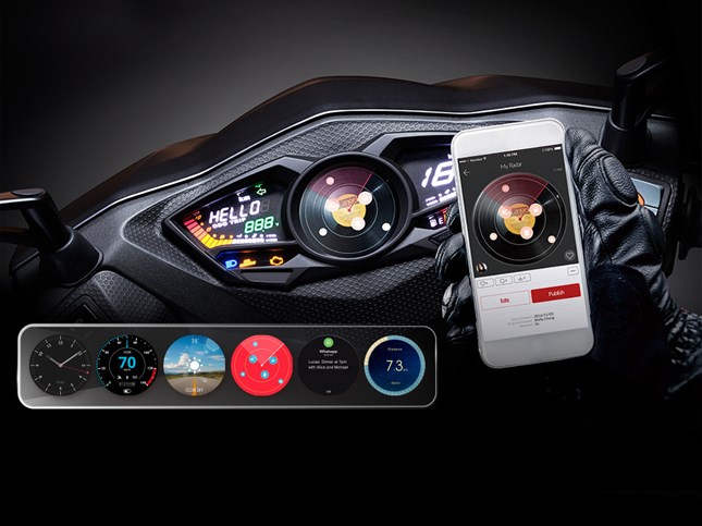 Noodoeは3つのツール「スマートメーター、スマートフォン専用アプリ、ハンドルコントローラ」によって構成され、スピードと時間表示といった基本機能のほか、天気予報、グループコンパスの表示。また停車時には各種SNSの更新通知や不在着信通知など、様々な情報が表示可能です。また各メーターは、ユーザーが撮影した写真を背景に設定したり、オリジナルの素材をもとに好みのデザインを作り上げることが可能です。作成したデザインはアプリを通じて世界に向けて公開することが出来ます。※安全上の予防措置として、車両が完全に停止した時にのみメッセージや通知を確認することが可能です。